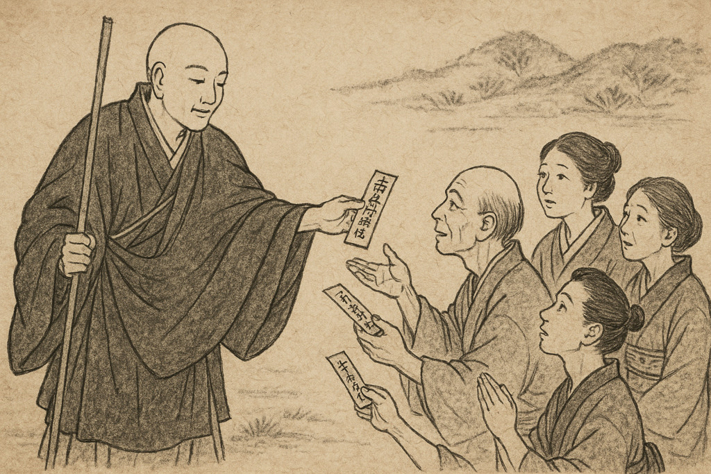 少し難しい表現ですが、ここで分かるとおり、一遍は名号を唱えることを重視しています。重視というか、それが全てだと言い切っています。だから、賦算という念仏の札を配り続けたのです。そして、配る際には、念仏札を受け取る者が、「南無阿弥陀仏」と一回唱えることになっています。ここで注意が必要なのは、札をもらえば極楽に行けるという訳ではないということ。むしろ、札をもらうことですでに極楽往生している。別の言い方では、南無阿弥陀仏になっているのです。